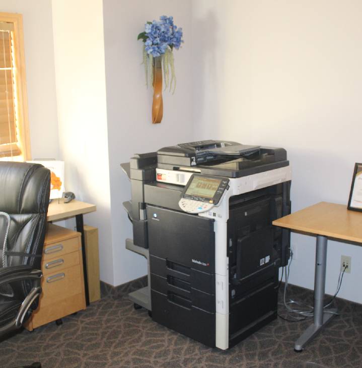 List of included items: desks, chairs, conference table, copy machine, refrigerators, microwaves, water cooler, and kitchen cabinets.
